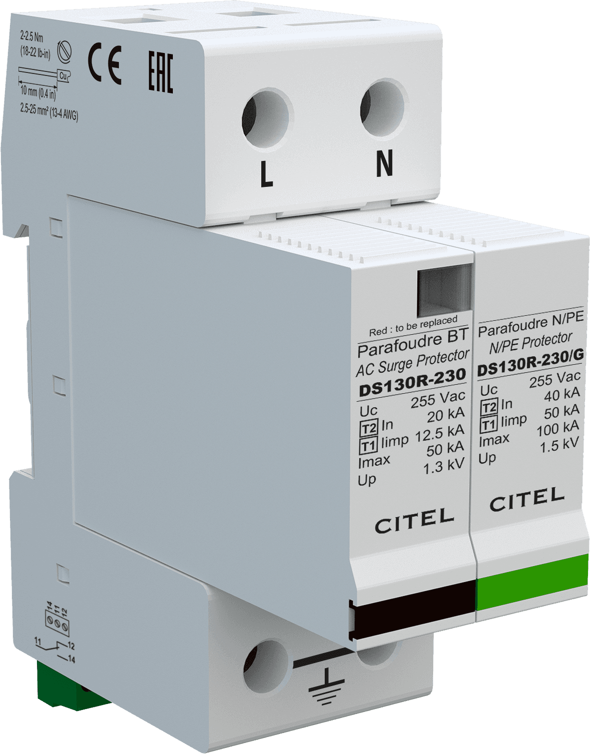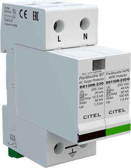 The DS130R is an extreme duty Type 1+2 designed to protect the entrance of the electrical installation. The DS130R is a one-pole SPD and can be used in common mode or common and differential mode. DS130R AC surge protectors are designed to be connected in multi-pole configuration to protect single-phase, 3-phase and 3-phase+neutral AC networks. This SPD is DIN rail compatible.